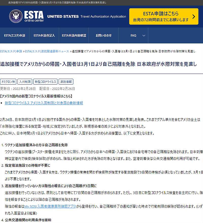 3月1日からアメリカからの帰国・入国者に対する制限が大幅に緩和されました。